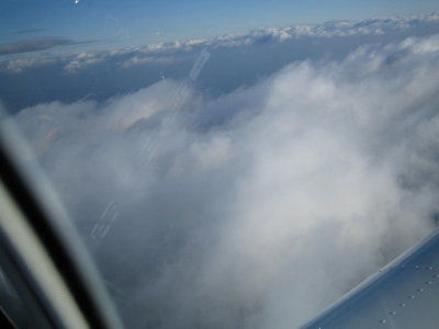 Nächstes Ziel war es also auf etwa 4.000 ft ein bisschen über Bielefeld und Hillegossen zu kreisen. Die Wolkenuntergrenze befand sich auf etwa 2.500 ft würde ich sagen. Das Wetter war immernoch ausgezeichnet. Als wir dann über den Wolken ein wenig gekreist waren, das ein oder andere Video im Kasten hatten (15MB – mal sehen ob ich das hochlade) beschlossen wir zurück via Schloß Holte zurück in die Platzrunde von Oerlinghausen einzufliegen. Funk und sowas habe ich alles bereits erledigt. Es ging mit etwa 500 ft pro Minute gen GND. Beim direkten durchstoßen der Wolkenuntergrenze (nur noch etwa 2.000 ft hoch) wurde es richtig ruckelig. Ich dachte erst, dass das sofort wieder aufhört, aber es hielt die ganze Zeit an.
